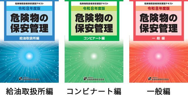 当協会では、消防庁のご指導により講習内容の充実、全国的な講習水準の確保などの観点から、全国都道府県消防主管課長会、全国消防長会などのご協力を得て「危険物取扱者の保安講習テキスト検討委員会」を設置し、危険物取扱者の資質の向上及び危険物施設の事故防止に寄与するため、講習種別に合わせて次の3種類のテキストを作成しています。